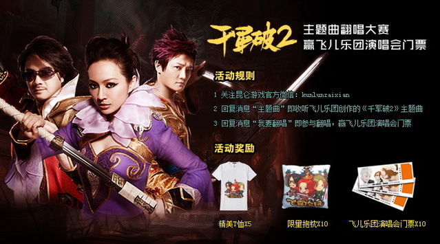 收录其中的《千军破2》游戏主题曲由飞儿乐团原创制作,想抢鲜试听的亲们只需